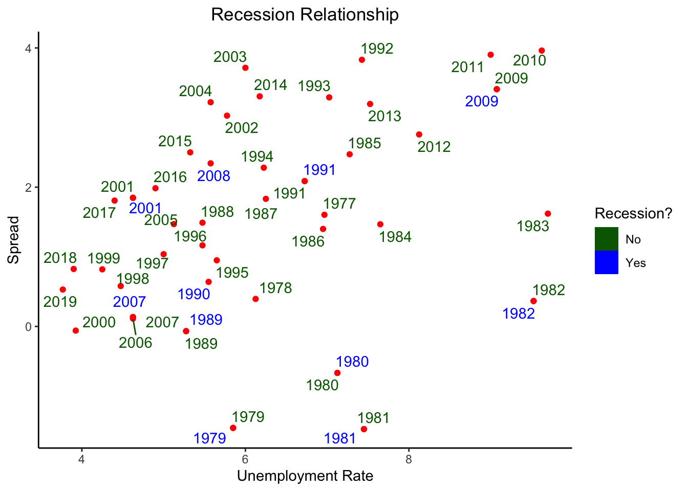 df_p = df_2 %>% select(year,mean_spread, mean_urate, mean_rgdp, rec_char) %>% unique()
